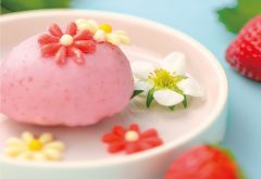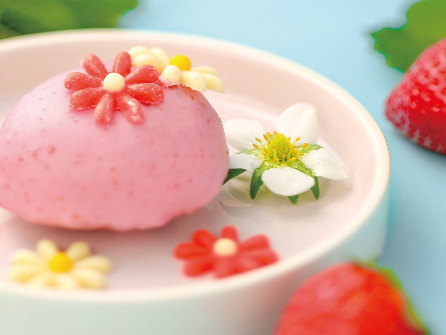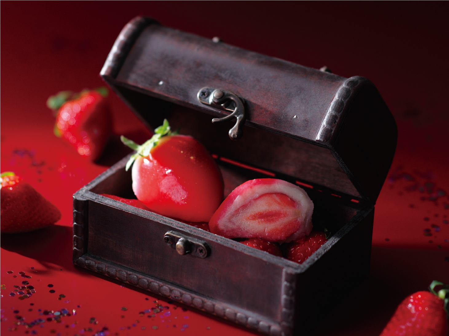ルビーのいちごぷるんとツヤめくいちごのの大福。吉岡製菓とコラボし、『ルビーのいちご』に『出雲ICHIGO縁』のいちごを入れました。 -
