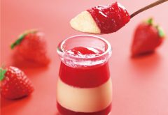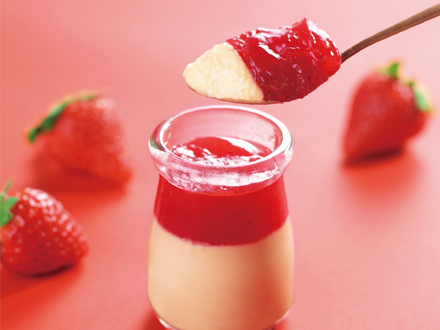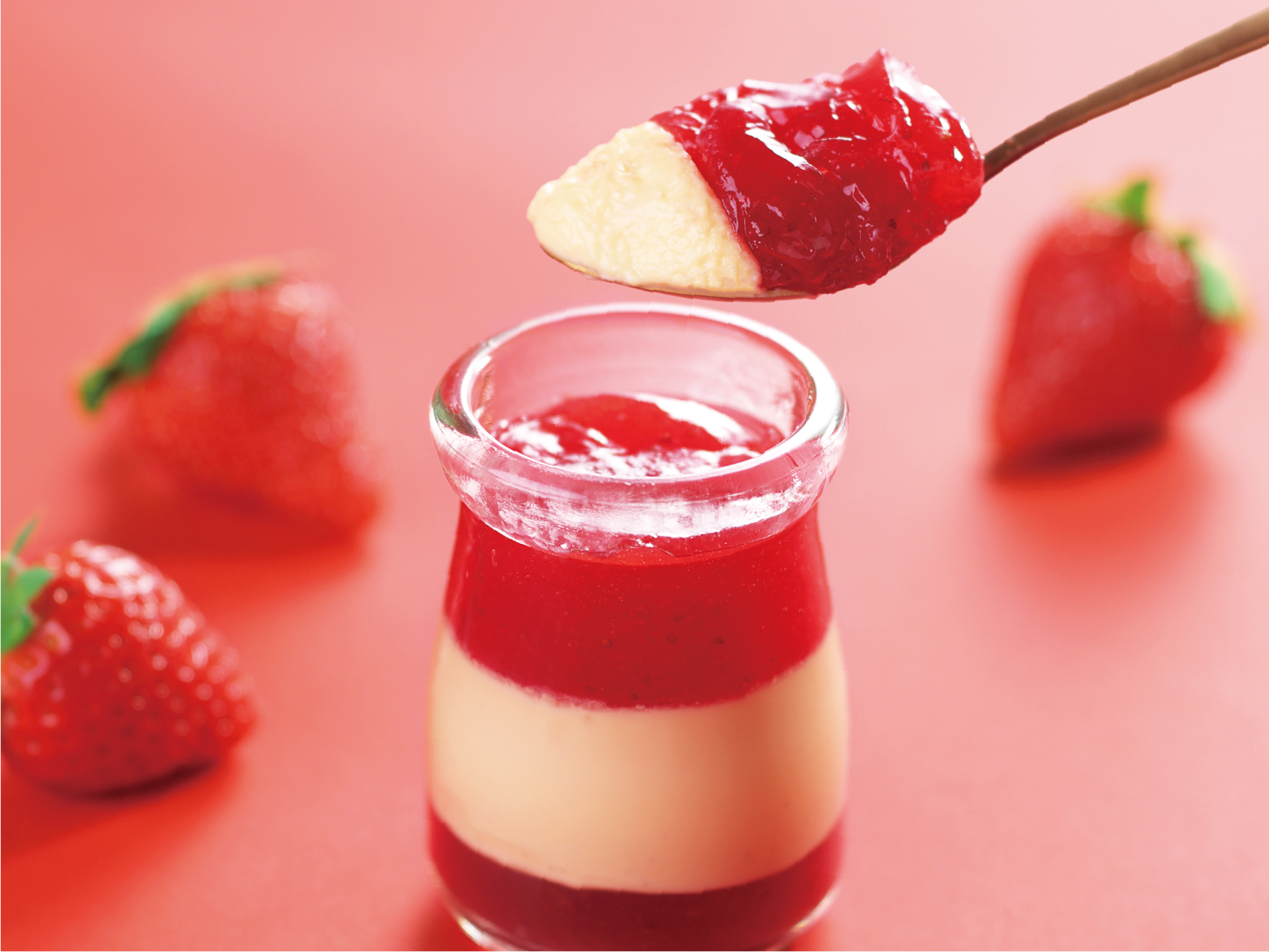 結ベリープリンたなべたたらの里の平飼い『彩り天佑卵』と木次牛乳をふんだんに使用した特濃プリン。そこへ出雲ICHIGO縁のいちごソースゼリーを乗せて仕上げました。 -